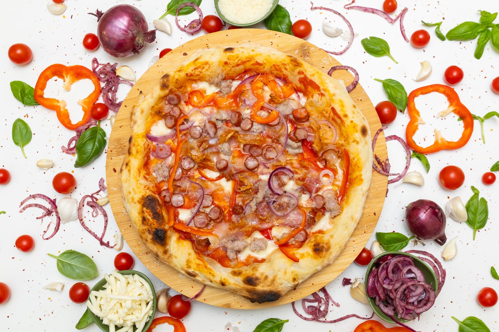 Ingrediente: aluat (300 g), sos de roșii (80 g), FIOR DI LATTE (100 g), mix carne (cârnați oltenești, pancetta, salsiccia – 100 g total), ardei (25 g), ceapă (25 g), ulei de măsline EVOO (5 g).