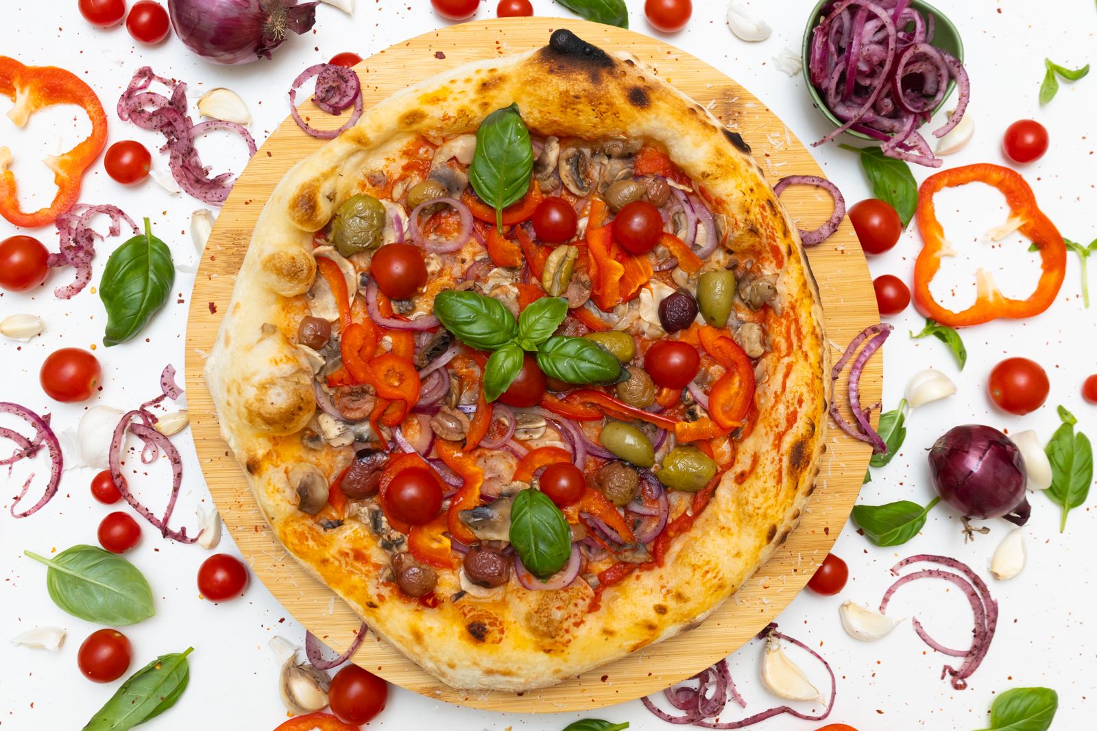 Ingrediente: aluat (300 g), sos de roșii (80 g), roșii cherry (30 g), ceapă (20 g), ardei gras (30 g), ciuperci (40 g), măsline (20 g), ulei de măsline EVOO (5 g).