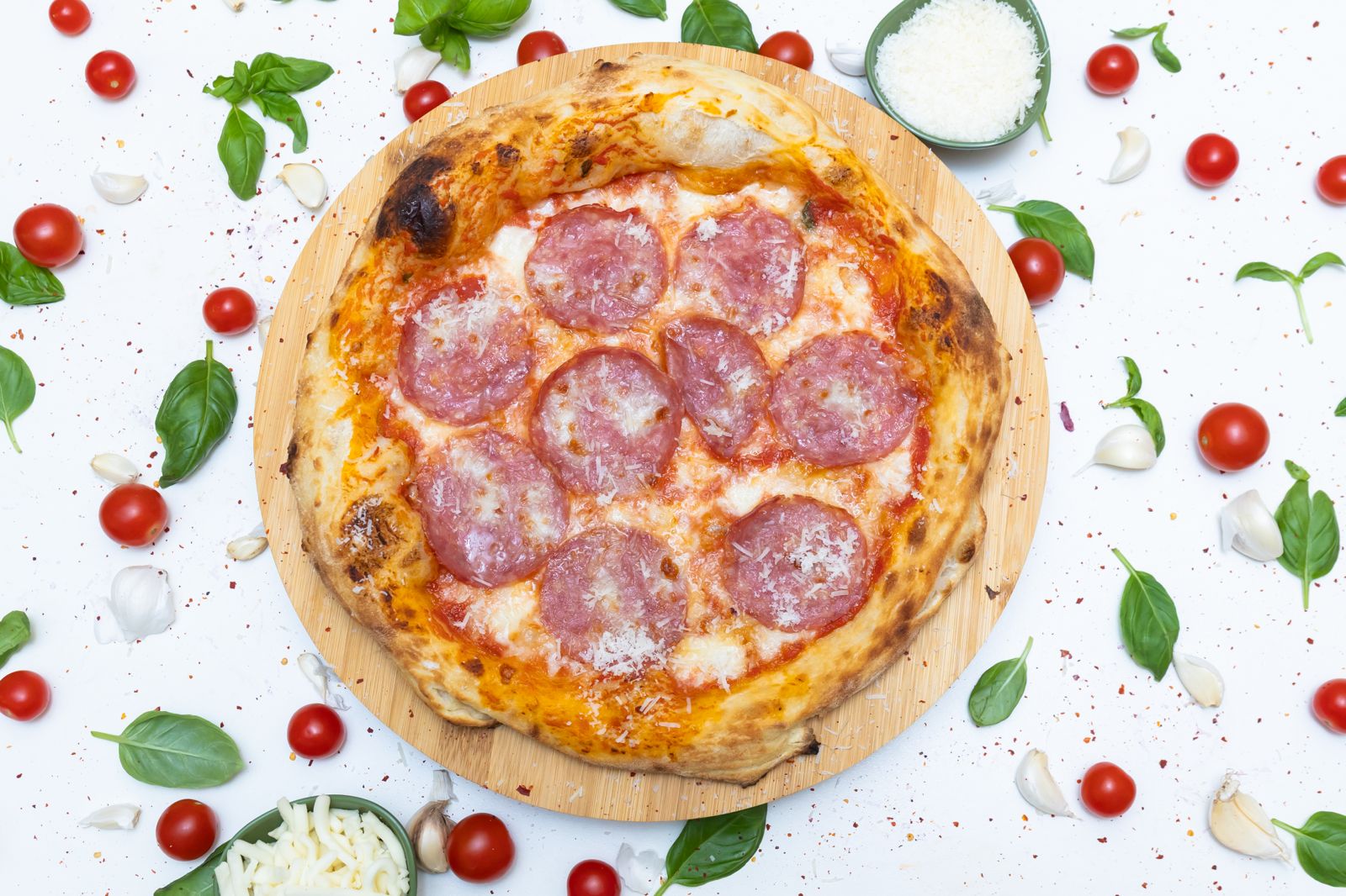 Ingrediente: aluat (300 g), sos de roșii (80 g), FIOR DI LATTE (100 g), salam Napoli (70 g), ulei de măsline EVOO (5 g).