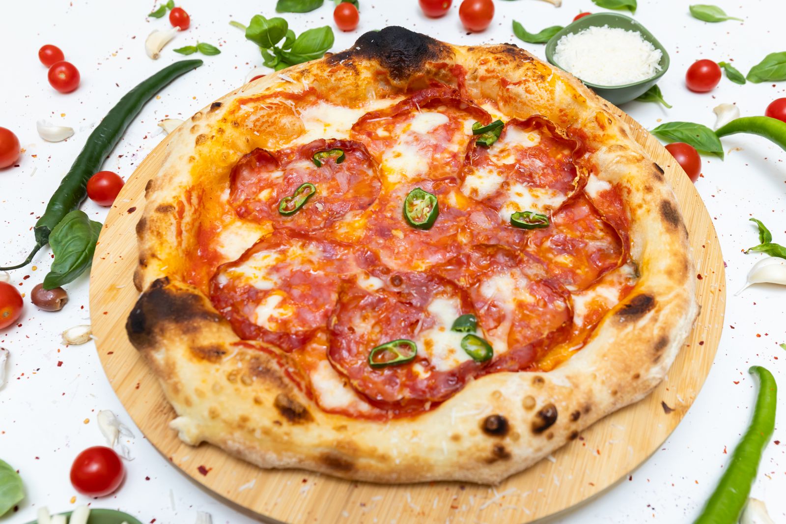 Ingrediente: aluat (300 g), sos de roșii (80 g), FIOR DI LATTE (100 g), salam Ventricina picant (50 g), salam Napoli (30 g), ardei iute (10 g), ulei de măsline EVOO (5 g).